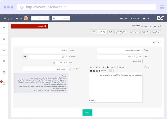 همه تاریخ ها در نقاط مختلف نرم افزار مثل گزارش ها، کارها، پروژه پروژهها، داشبوردها و تقویم ها می تواند شمسی و فارسی باشد.